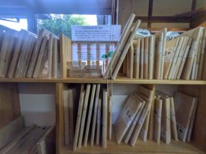 ヒノキのまな板は、まるで本屋さんのように立てて並んでいますが、大きさや種類が豊富なんです。